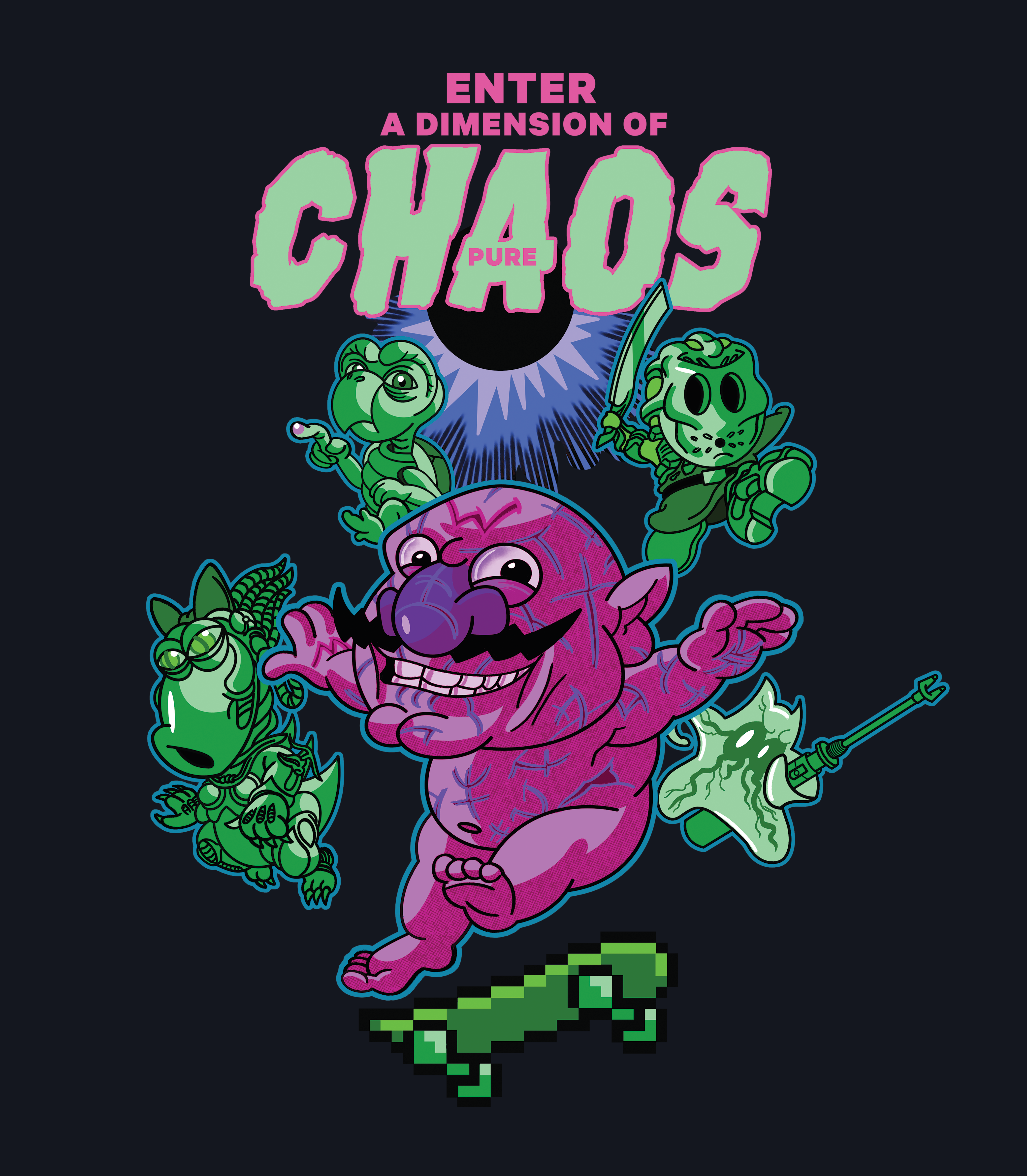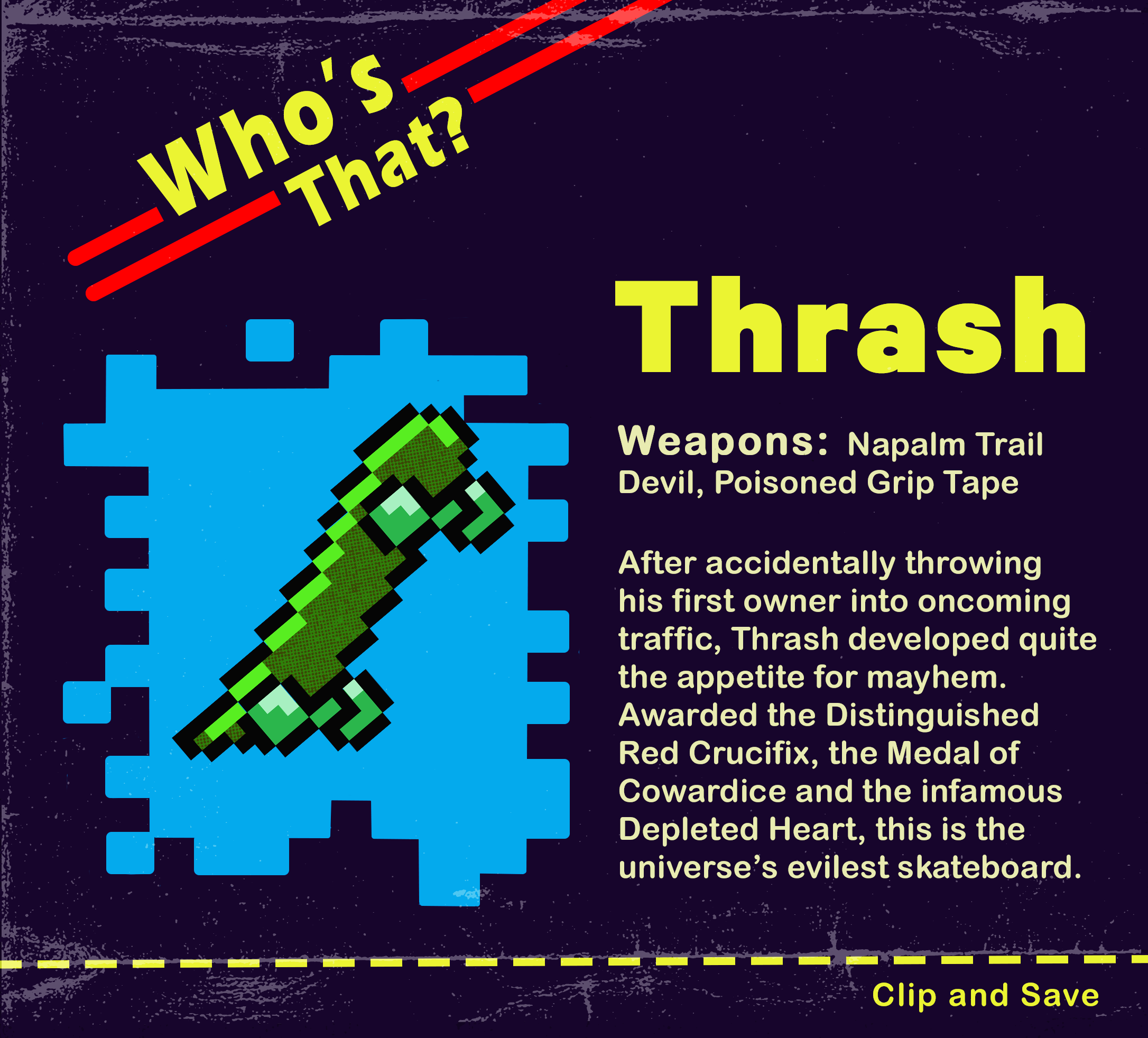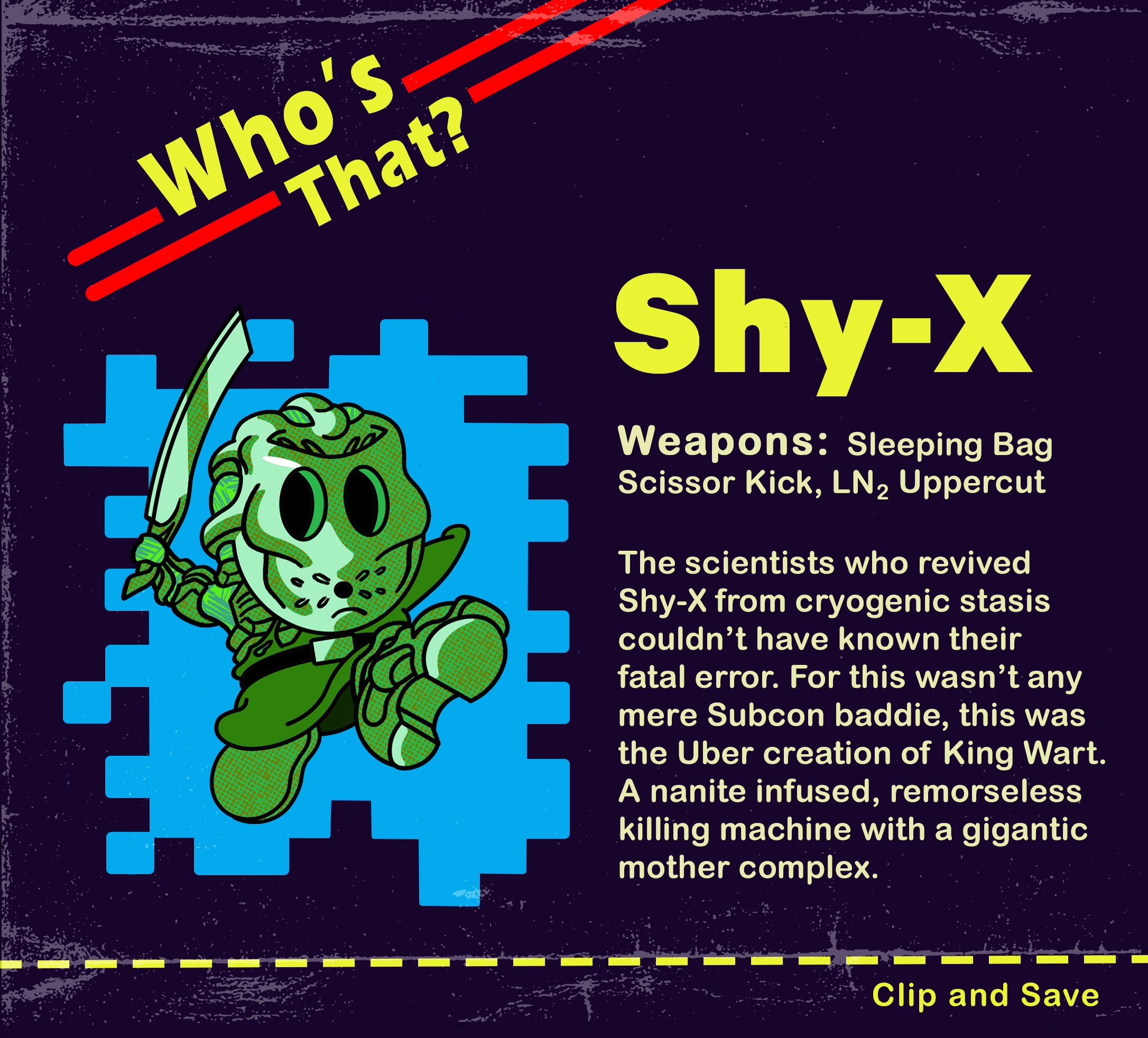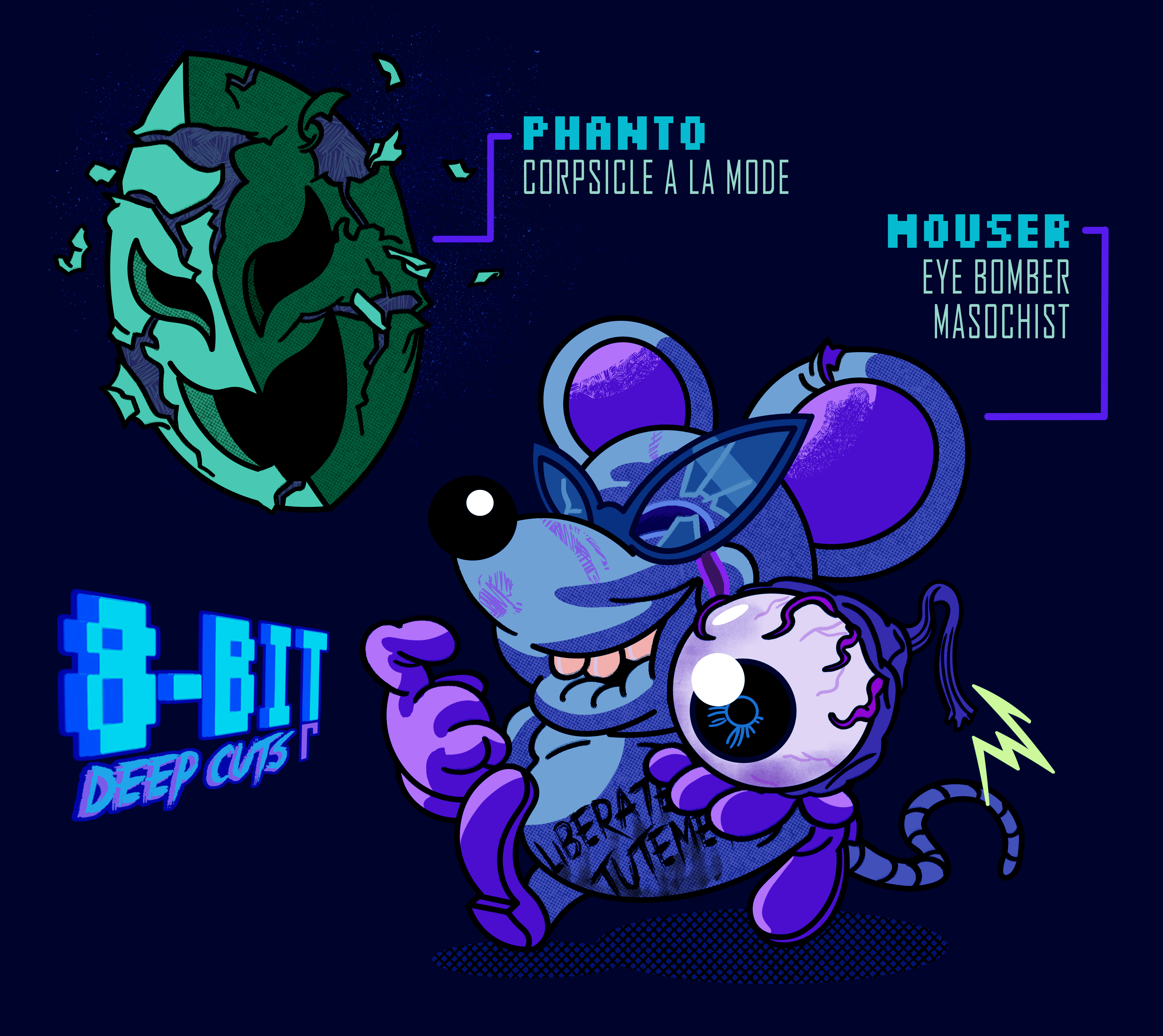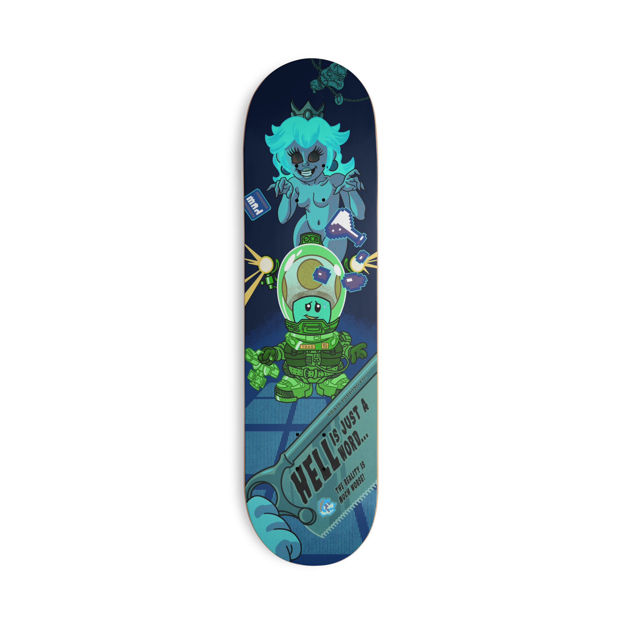 What had started as my first skateboard design, quickly grew into it's own warped NES universe. Think, the cast of Mario Brothers fused with the sub-genre of Space Horror. This ambitious world featured numerous advertisements, character bios and a t-shirt.